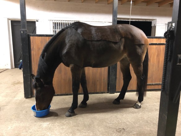 Dressyrpasset gick bra, det blev ett enkelt lösgörande pass utan några konstigheter, ett typiskt ”joggingpass” skulle jag vilja säga. Lite sidvärts, lite övergångar och mycket stora böjda spår. Hon kändes fin!