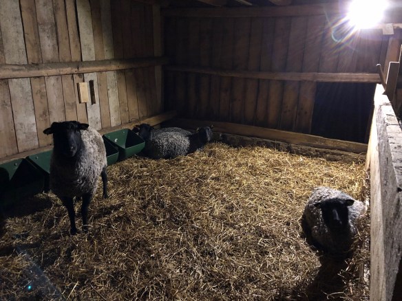 Jag nattade fåren innan jag gick in också, de låg och hade det ganska gott inne i sitt lilla hus, men tackade inte nej till lite påfyllning av sitt hö och lite kli på kinden.