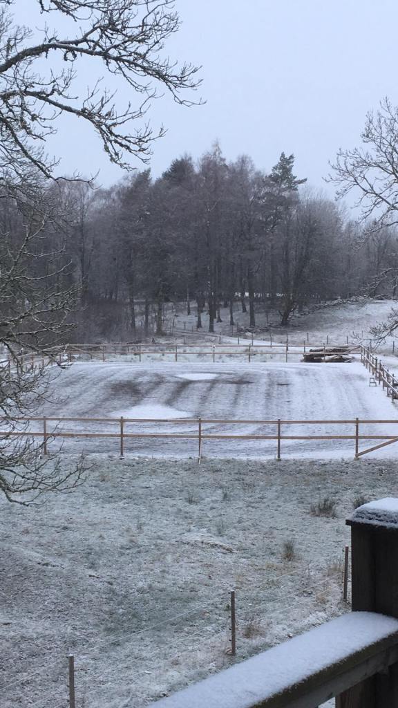 Vi fortsätter med salt, i natt blev det ju minusgrader och så kom det lite snö på det, så det var ju lite spännande att se hur paddocken skulle se ut under dagen. I morse när Loke och Axel vaknat såg det ut så här: