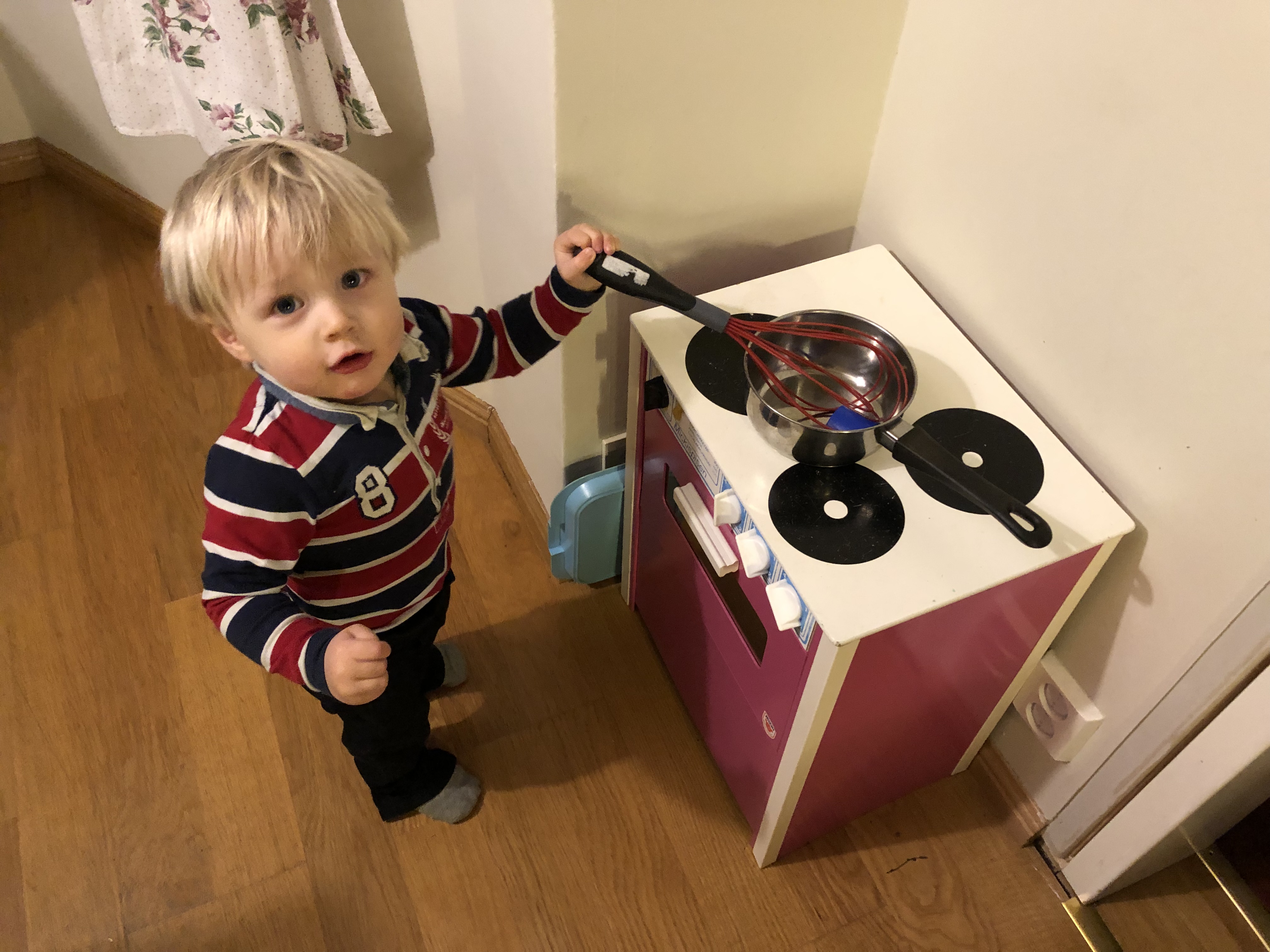 På vägen in gick vi via lekstugan och tog med oss leksaksspisen in. Loke gillar ju att leka med alla köksredskap så vi tänkte att han skulle gilla denna också, och det gjorde han såklart!