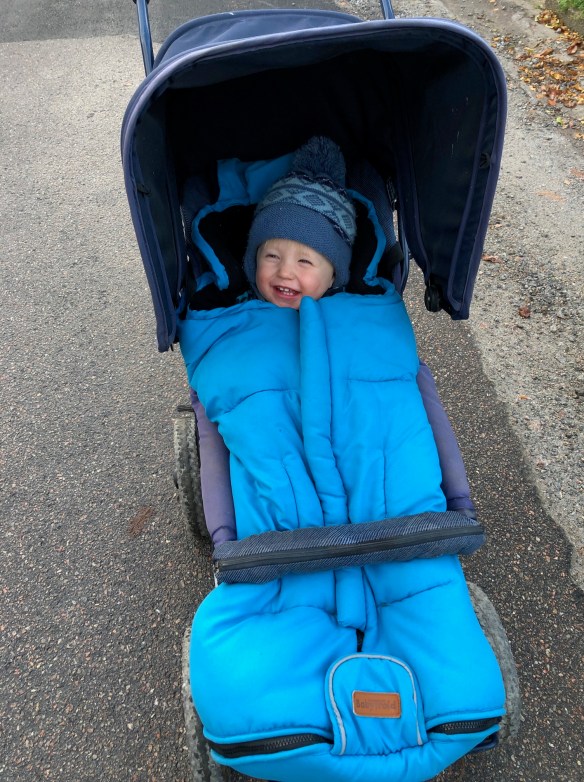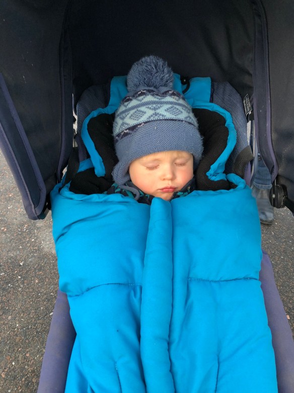 Vi åt lunch tillsammans och sen gick vi en promenad så Loke kunde få sova i vagnen. Han var dödstrött, men glad. Det är två minuter mellan dessa bilder här nedan, den första tagen precis när vi stoppat ner honom i vagnen och det tog inte många metrar innan han slöt sina små söta ögon 🙂