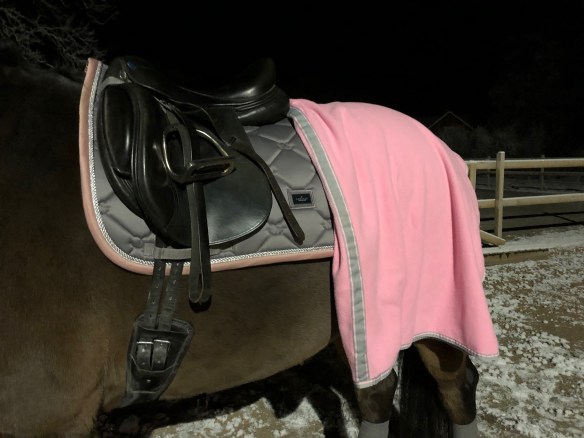 Efter ännu en ganska kall natt (neråt nio-tio minusgrader) var banan lite mer frusen i går, men ändå helt klart ridbar! Jag piffade till Kaprifol lite extra, alltid ger det extra motivation i vintermörkret!