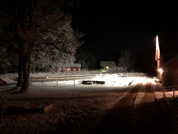 Det var en mysig ridtur och Kaprifol var på väldigt bra humör. Pinnade glatt på och travade med stora och luftiga steg, det blev lite galopp på en gräsväg och över gärdet också, där det låg lite snö. Det är fascinerande hur mycket ljusare det kan kännas så fort det kommer lite snö på backen, månen gjorde sitt också just denna kvällen.