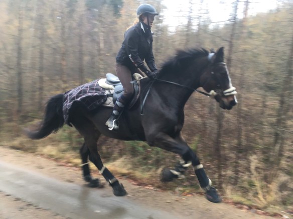 Nästa övning är att fatta höger galopp i vänster varv, låter ju också enkelt men kan vara ack så svårt. För att underlätta de första gångerna rider jag som en båge och tillbaka mot spåret så jag enklare kan ha henne lite ställd åt det hållet som jag ska fatta galopp. Det tog ett gäng felfattningar innan poletten trillade ner och när den väl hade gjort det kunde jag fatta ”fel” galopp även på rakt spår i båda varven. Duktig! Avslutade med lite relativt kravlös galopp längs fyrkantspåret i båda varven så hon fick galoppera på lite efter alla avsättningar och fattningar. Får se om hon kommer ihåg det här till nästa gång så vi kan jobba vidare!