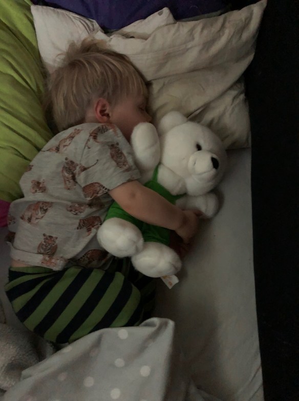 För egen del hade jag en ganska lugn dag igår. Vi hade Bergmekanikgruppens Höstmöte hos oss igår så jag deltog och lyssnade på alla föreläsare, visade våra lab-lokaler och höll en egen presentation om mikrosprickor och bildanalys. Vi höll på lite längre än min ”vanliga jobbdag”, så jag var hemma en dryg timme senare än vanligt. Då åt vi broccoli- och blomkålspaj, väldigt gott sa Loke! Och sen hann vi inte göra mycket mer innan Loke fick pyjamas, borsta tänderna, välling i soffan och sen gick jag upp och la honom. Det tog inte mer än nån minut så låg han på kudden, kramade sin björn och somnade gott. Han hostar fortfarande lite nattetid, men i natt var han mycket bättre än tidigare i veckan så det var skönt.