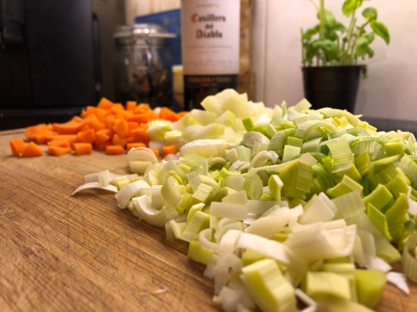 Köttet fick koka sig gott med lök, morötter och vitlök i rödvin, senare tillkom champinjoner och säkert nåt mer, och så åt vi det med potatis.