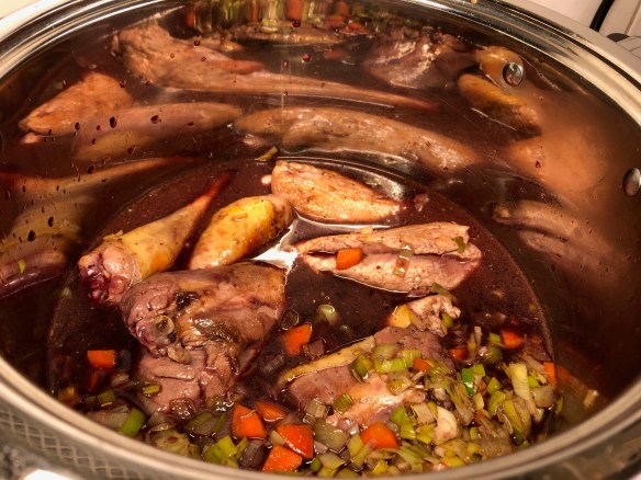 Så vad gör man med en nackad tupp då? Jo den skållades så det gick enkelt att ta av fjädrarna och sen blev den söndagsmiddag i form av Coq au Vin!