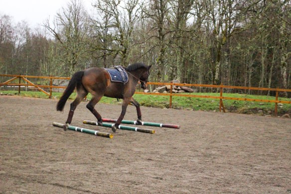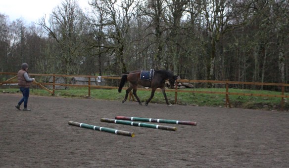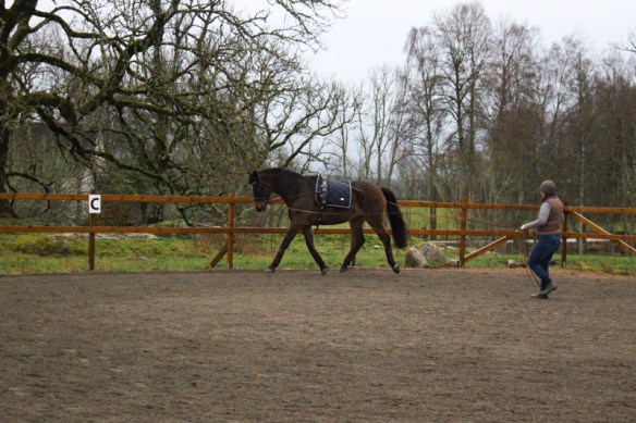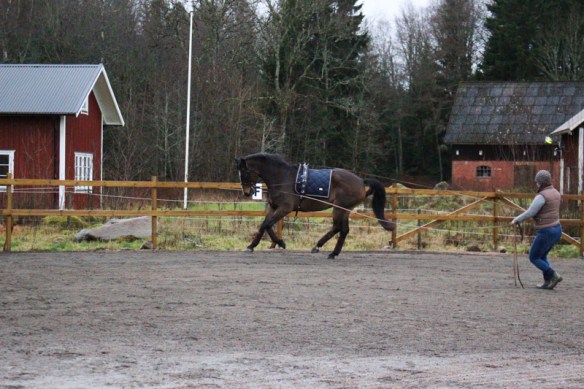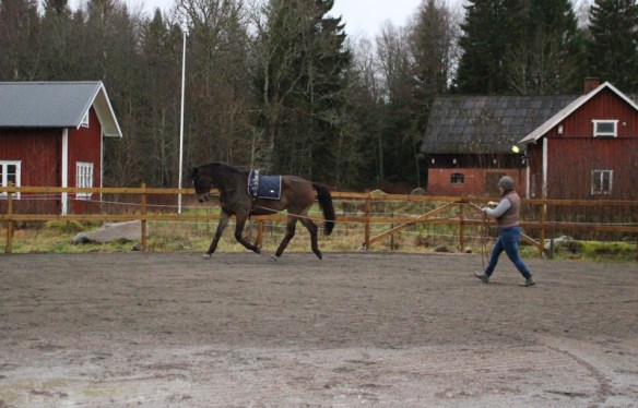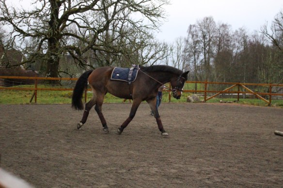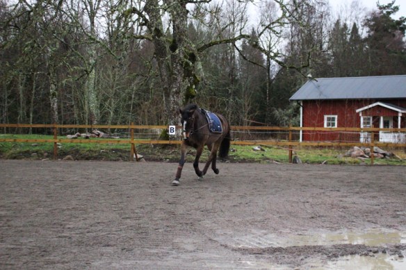Lite bilder från i söndags ska vi väl ha också! Det var grådassigt väder, men att paddocken är så här trevlig en bit in i december ska vi inte klaga på! Kaprifol var som sagt väldigt ambitiös och arbetsvillig från start och såg väldigt spänstig och fin ut, dock blev hon då gärna lite ”ihopkrullad” i formen ibland, hade gärna sett att nosen kom fram lite i de lägena, men det är inte alltid så lätt. Hon fick även trava över lite bommar och det gjorde hon fint.