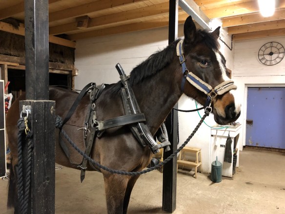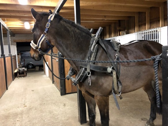 Jag kopplade även på draglinorna som jag har till vagnen och sen gick vi ut till paddocken och hon fick ”känna lite” på att röra sig i selen. Hon verkade inte bry sig om den alls. Hon skulle även få dra lite, såklart, och det blev samma halvpall som sist men nu la jag på en 25kgs saltsäck så det blev lite motstånd åtminstone.