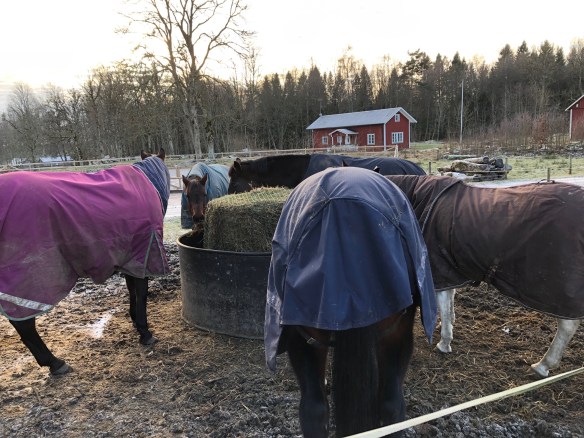 .Glada hästar med ny höbal.