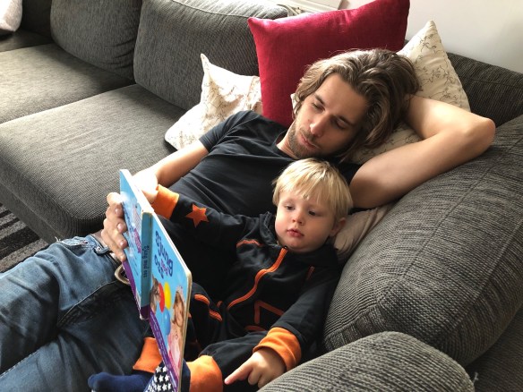 Mysstund i soffan med en ”bra bok”. Det är bara en sida i den här boken som Loke är intresserad av, den innehåller bondgårdens djur och därmed nästan alla hans favoriter.