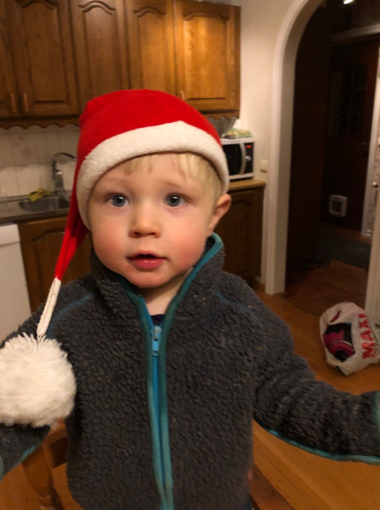Jag rotade fram lite t-shirts i större storlek häromdagen och hittade en tomtedräkt! Mössan såg ut så här.