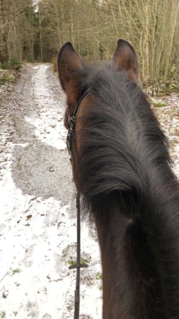 Kaprifol fick skritta fram och av i skogen och så travade vi lite i paddocken där i mellan. Vi saltade den i förrgår men den var ganska frusen idag ändå tyvärr, det var lite snö på den när vi saltade plus att den redan var lite frusen så det är gissningsvis därför. Den är nyharvad i alla fall så den är jämn, så det gick att trava helt okej ändå! Och Kaprifol var fin 🙂
