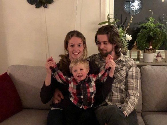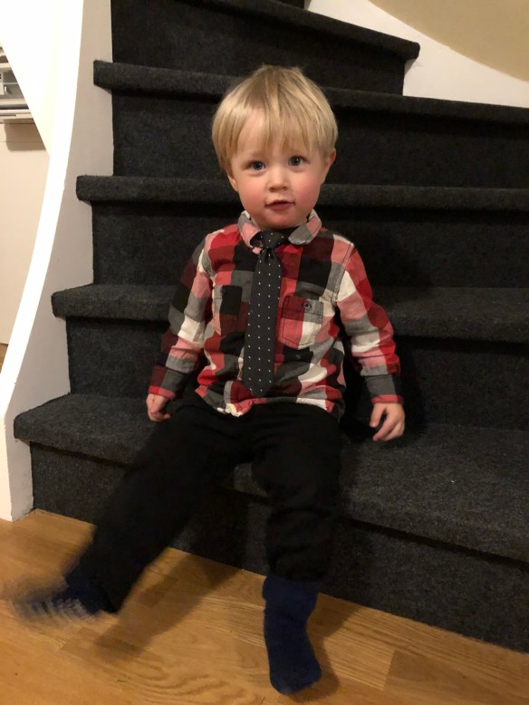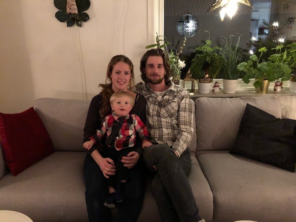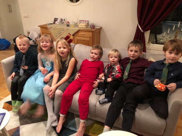 Nu har vi landat i soffan efter ett intensivt dygn i Åsaka! Loke fick finkläder på och sen åkte vi timmen hem till syrran. Mamma och bror med barn var redan på plats och andra systern med familj kom strax efter oss.