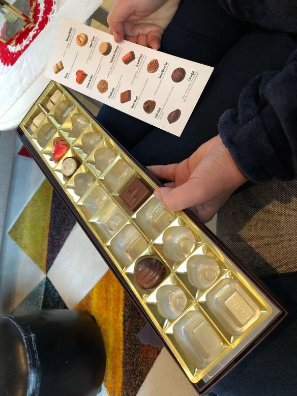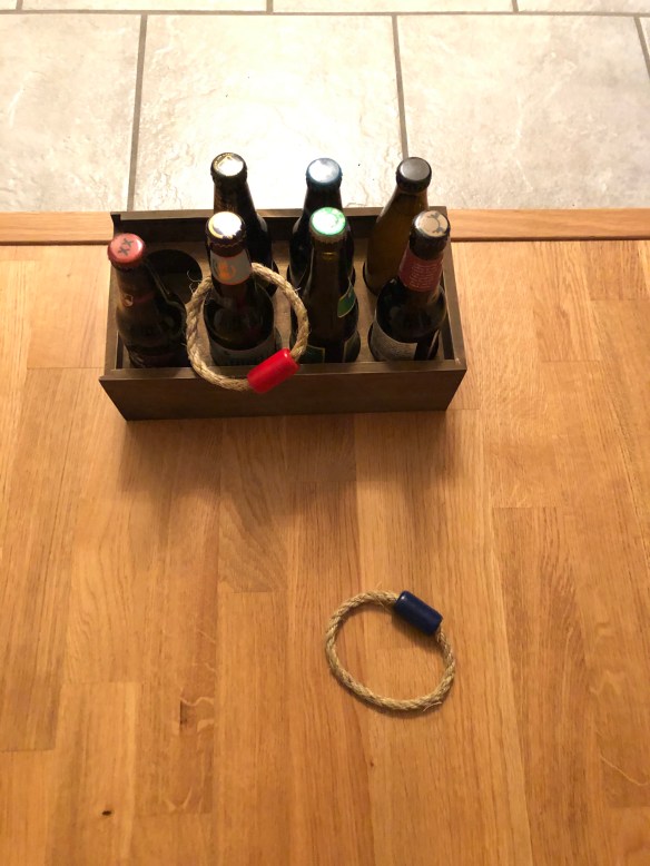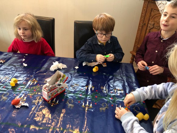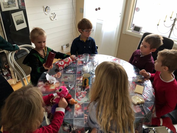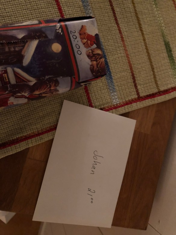 Min alldeles egenkomponerade julklappslek gick ut på att alla vuxna och barn fick ett klockslag tilldelat. När klockslaget var slaget skulle dess julklapp öppnas och den var tvungen att innehålla något ätbart eller drickbart och det skulle dessutom förtäras innan nästa julklapp öppnades. Barnen och de vuxna fick separata ”listor” och eftersom vi var sju respektive åtta i varje grupp blev det nästan en julklapp i timmen, från det att vi började klockan 12.00. De flesta av de vuxna klapparna hamnade på bild!