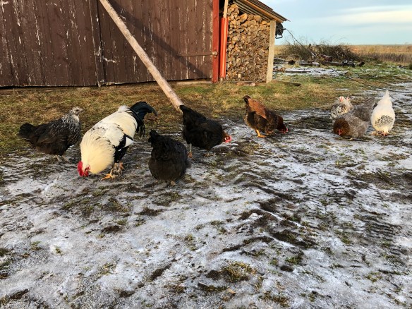 Hönsen fick komma ut i det fina vädret och våra lånehönor vågade sig ut för första gången sen de kom (fegisar!). Ett fint gäng! Tuppen blir stiligare och stiligare också!