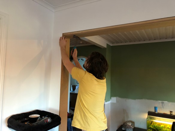 Vi kom även fram till att vi ville sätta upp alla dörrlister för att sedan kunna sätta panelskivorna emot dessa. Så listerna letades fram och spacklades, slipades och målades. Även dörrhålet målades. Och sen satte vi upp listerna runt valven in till köket och kontoret.