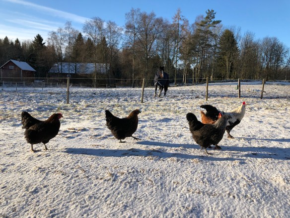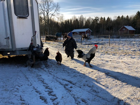 När Axel vaknat gick vi ut och matade fåren, släppte ut hönsen och körde ut en höbal till hästarna.