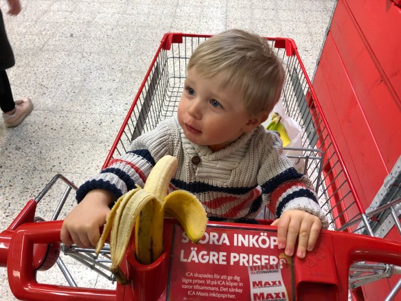 Vi passade på att handla lite innan bowlingen. Loke gillar att många affärer ger bananer till barn. Bananhållare på vagnen finns det ju tillochmed!