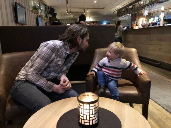 Han hängde med riktigt bra och tröttnade inte en enda gång under middagen, Axel fick en kopp kaffe efteråt tillochmed! Sen tackade vi för oss och gick lite innan resten av vårt sällskap, så var klockan nånstans mot halv nio tror jag. Sen hann vi nog inte ens ut från Alingsås innan han sov i bilen 🙂 Väl hemma bytte vi blöja och tog på pyjamas och så fick han en flaska välling och sov väl samma sekund som det var slut. Sen sov han till tio i åtta vilket väl får räknas som högsta betyg tror jag!