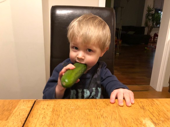 Tacos åt vi till middag! Loke kan numera klättra upp även på köksstolarna så det gjorde han igår när jag hackade grönsaker. Och så stal han gurkan.