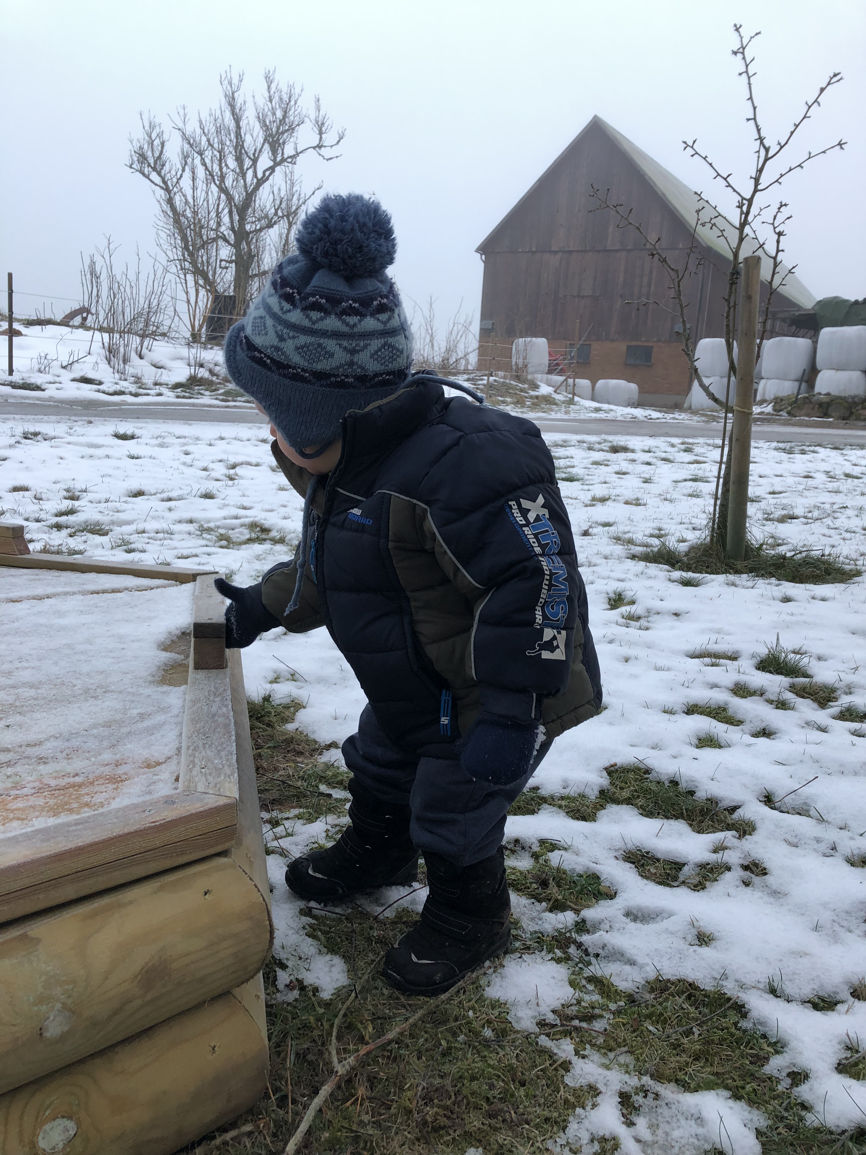 När Axel vaknat gick vi ut och matade fåren, släppte ut hönsen och körde ut en höbal till hästarna.