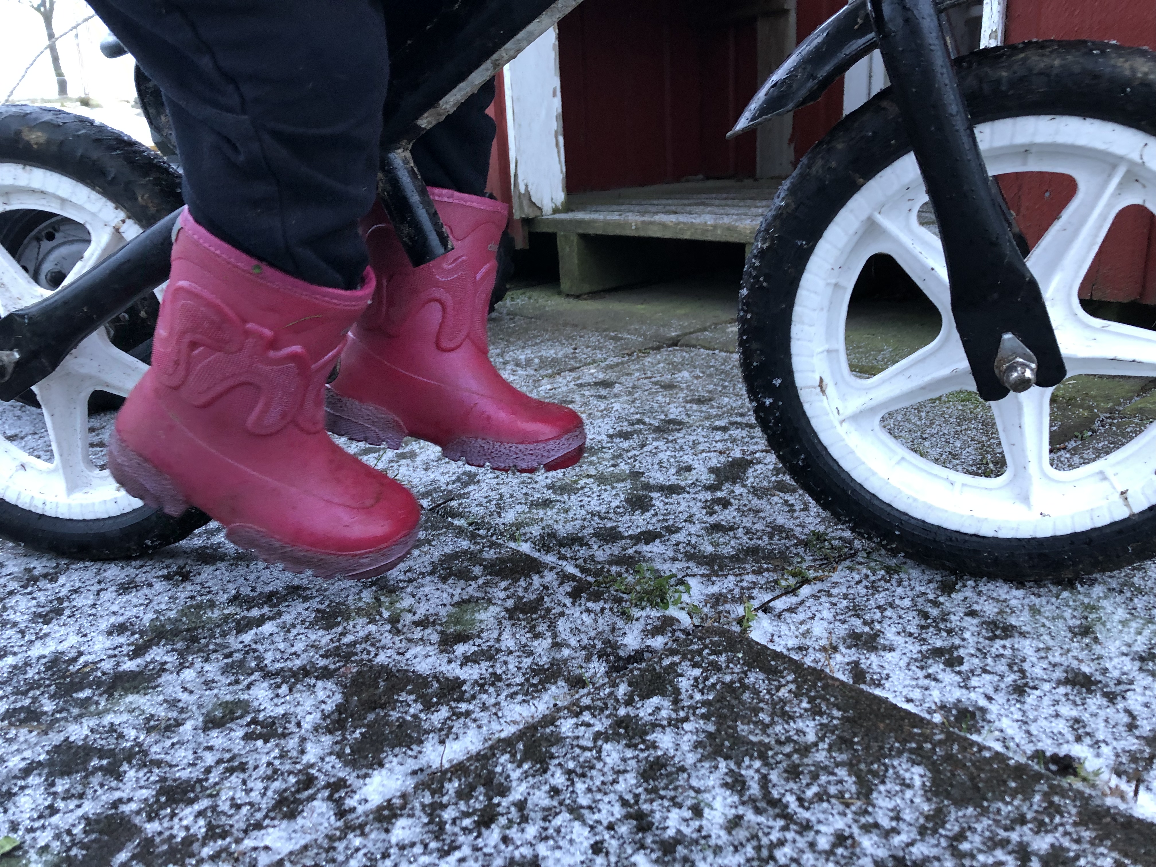 Loke ville prova springcykeln och det fick han, men trots sadeln på lägsta höjden fattas det nog en decimeter benlängd innan den passar, hehe. Är nog bra det, tror inte han är betrodd med detta fordon ännu.