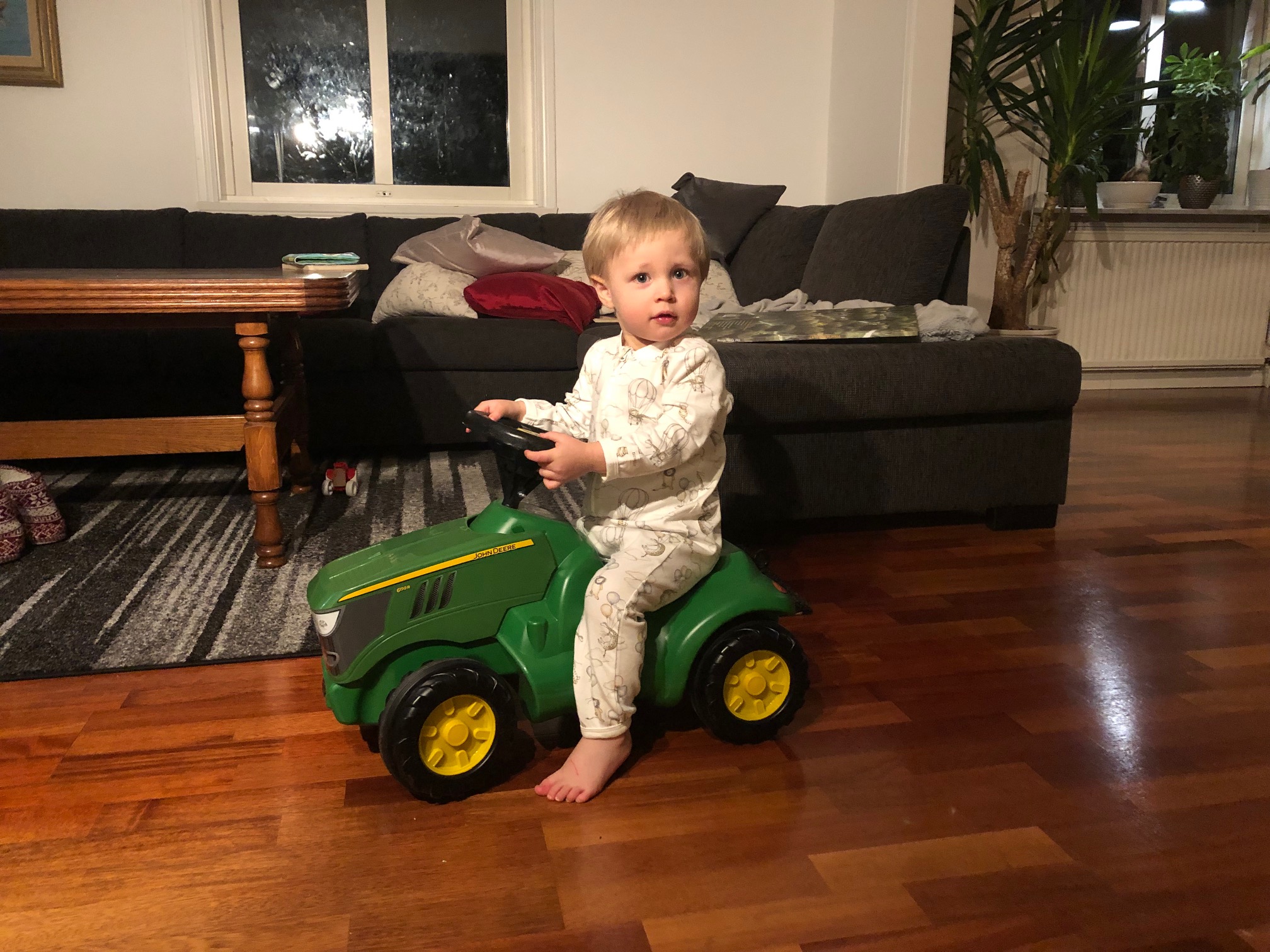 Lite traktorkörning på kvällskvisten, han har förstått att man kan vrida på ratten men är lite osäker på om han helt ut fattar att han svänger då.