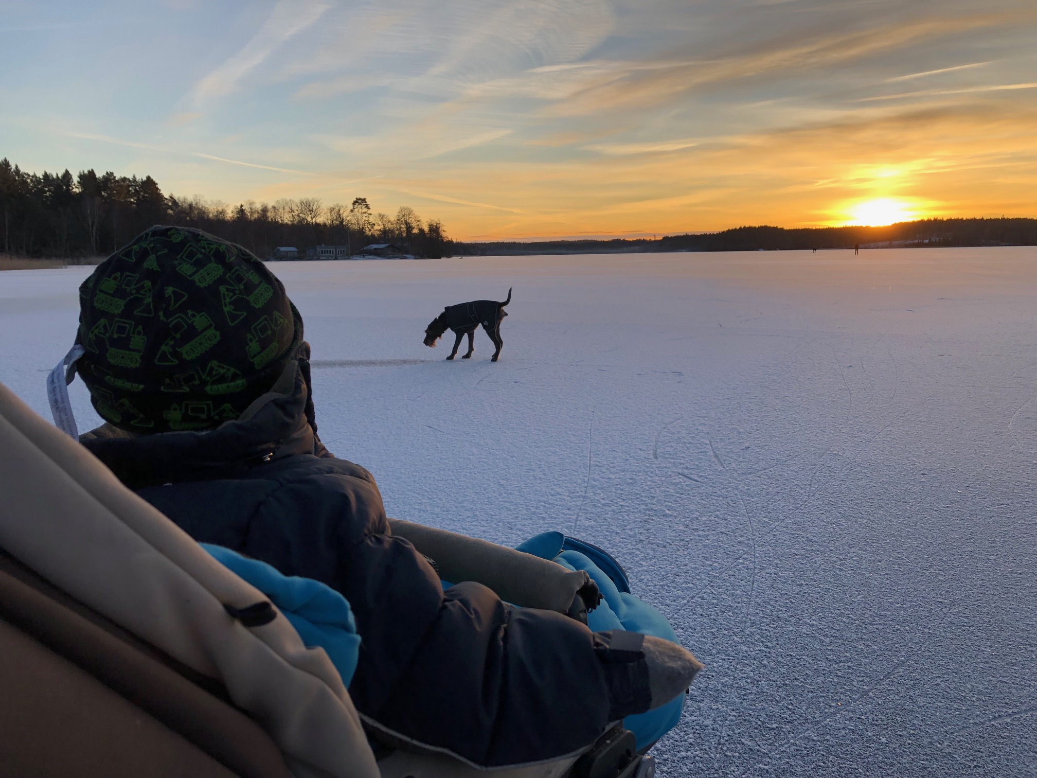 Loke tyckte det var roligt att vara ute på isen, främst när det blev frasiga ljud under skridskorna tror jag. Jag trodde att han skulle somna när han låg så gott där i vagnen, men han höll sig vaken hela tiden.