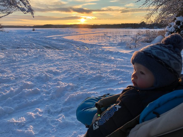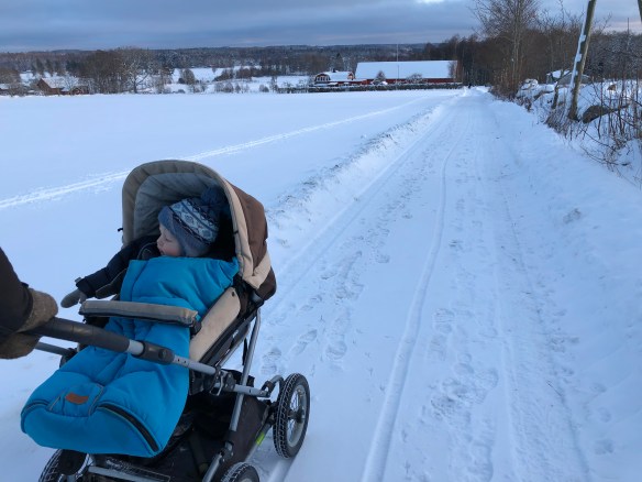 När pappa åkt hemåt lite senare gick jag och Loke ut. Loke fick hoppa ner i åkpåsen i vagnen för naptime och så gick vi en promenad med Kaprifol på släp. Passade ganska bra med en lugn dag för hennes del idag, och kanske lite skönt att bara skritta lugnt på asfalten utan snömotstånd och halka.