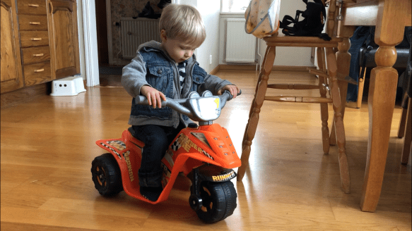Det finns en knapp på den som driver den framåt, Loke hittade direkt knappen såklart men förstår inte riktigt att han kan hålla den intryckt för att fortsätta åka. Mem det lär han sig nog snabbt!