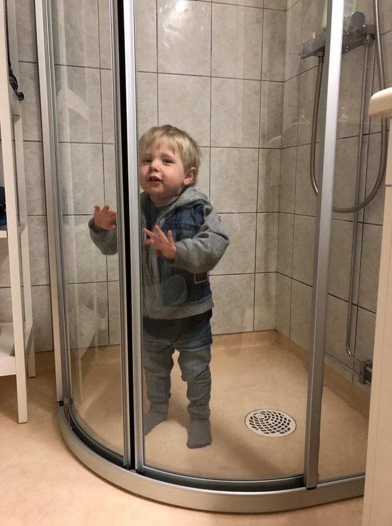 Loke tycker nya duschen är jätterolig. Dörrarna är lätta att dra och stänger enkelt, han kan dock inte öppna dem, hehe.