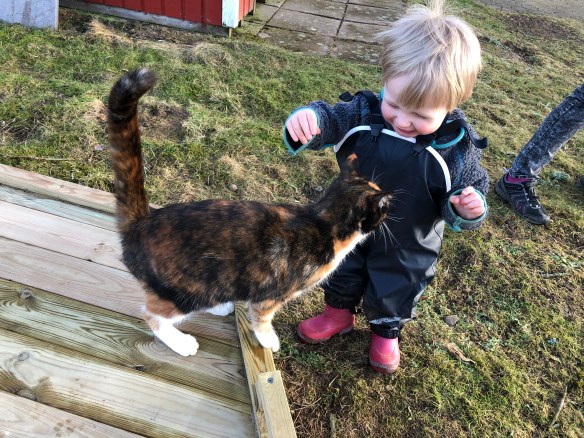 Det var fint väder så vi var ute ett flertal gånger igår. Lekte, och krattade lite löv och ogräs från rabatterna. Katterna var med stundtals.