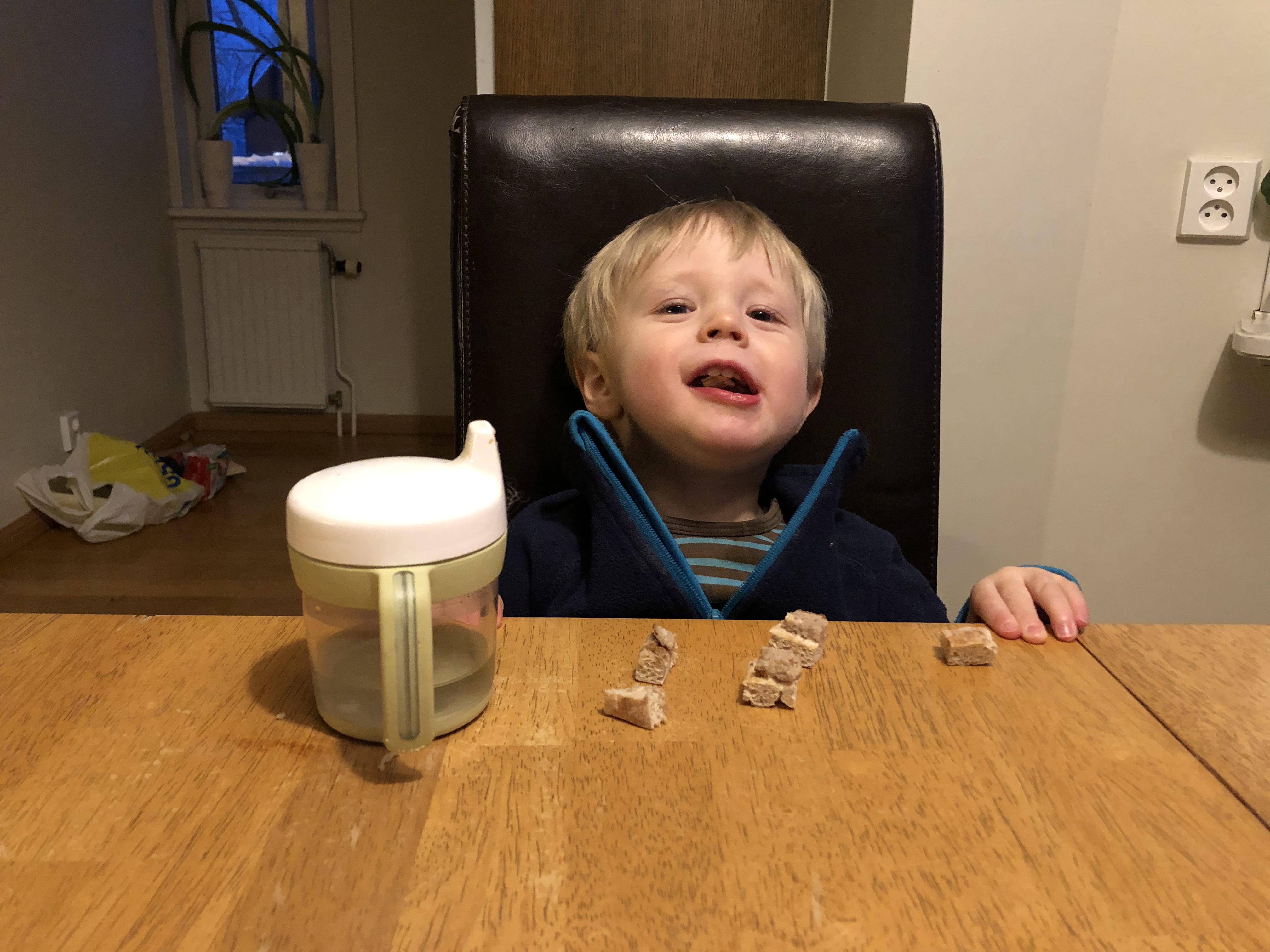 När vi var tillbaka i huset var vi alla lite kyliga och då passade det ju bra med lite nyponsoppa! Tror att det var Lokes premiär, det var ingen ny favorit men det framkallade inte heller några konstiga miner.