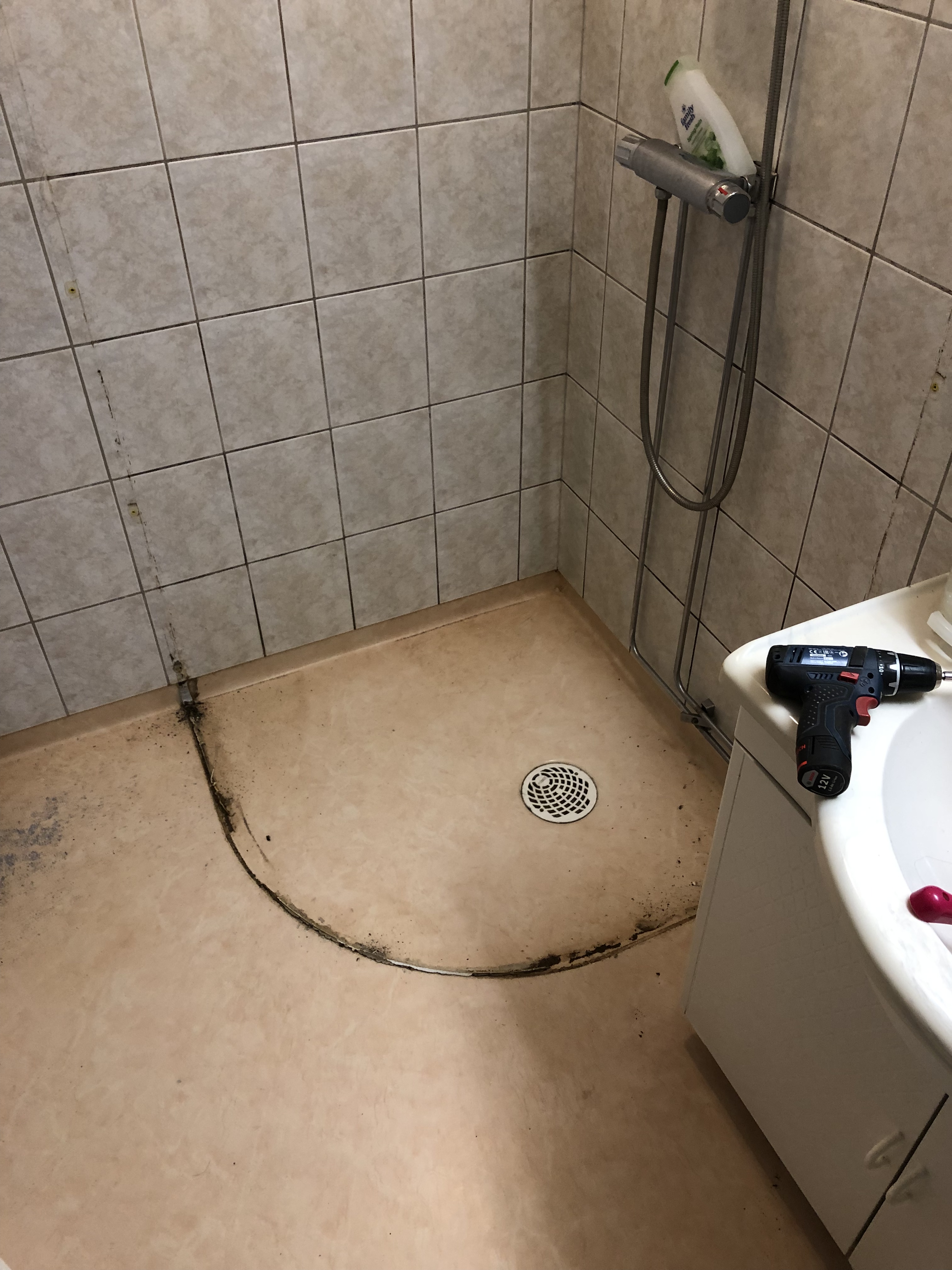 Sånt här vill jag inte visa egentligen för det ser ju sjukt ofräscht ut, men ja, så var det. När gamla duschen var utslängd var det sanering som gällde och all gammal svart silikon skrapades bort och det skurades.
