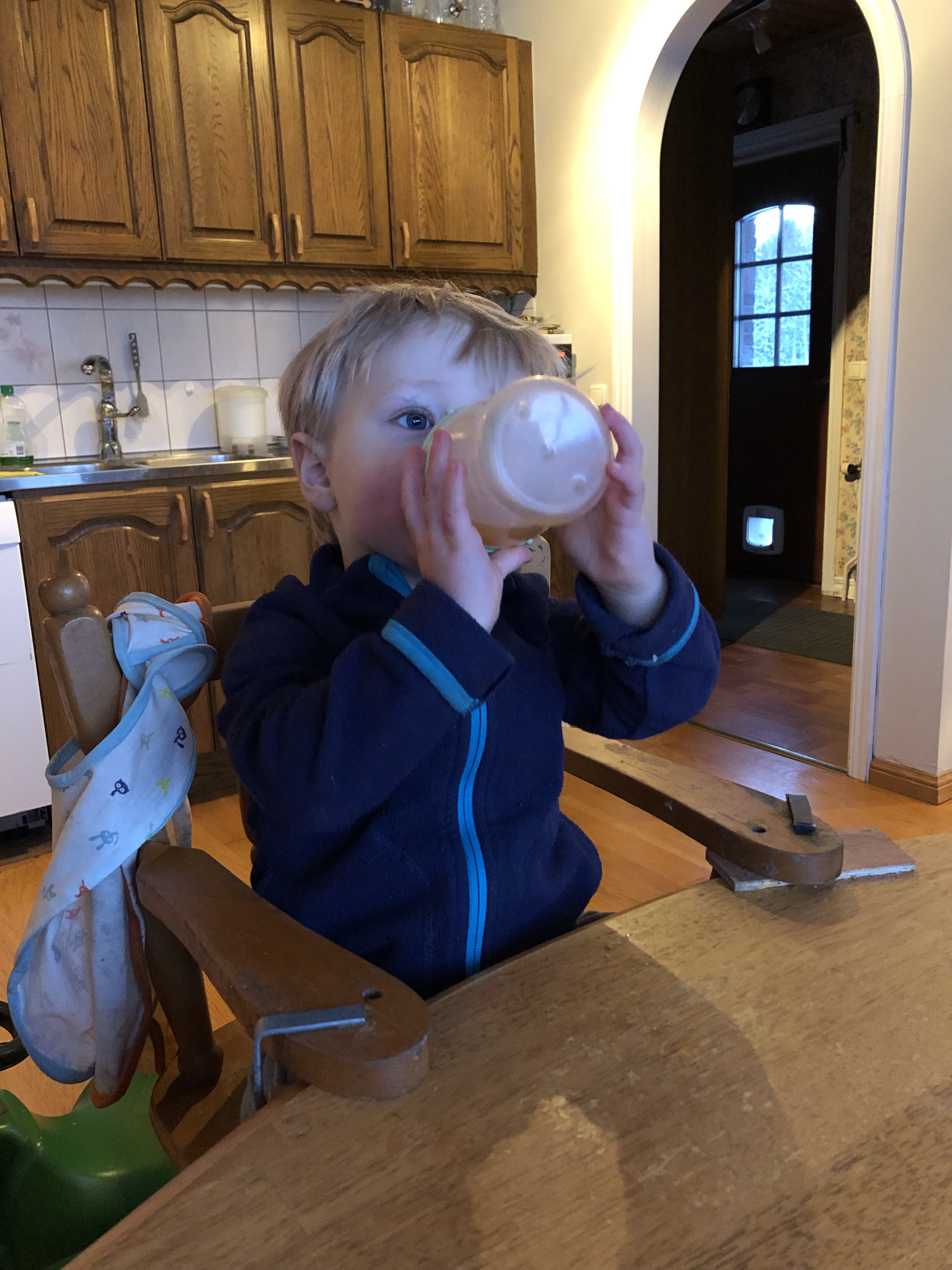Loke har kindtänder på gång och har sedan i helgen varit rätt ”gnällig”, med kort stubin och lätt till gråt. Han har sovit rätt dåligt med många uppvak och ”skrik i sömnen” och ätit dåligt, och det bidrar ju inte till en gladare kille heller precis! När vi har varit iväg eller haft besök hemma har han varit glad, men så fort inget distraherar honom blir han snabbt tvärilsk om nåt inte går som han vill. Händerna är ofta inne i munnen och pillar och vid middagen igår stoppade han in små köttbitar i munnen (som han vanligtvis älskar) bara för att börja gråta och inte vilja ha mer. Med gråten i halsen pekade han på vällingflaskan, stackarn. Så vi proppade honom full med välling och gav honom en sked Ipren mot tandvärk och la honom i sängen, och han sov till halv sex i morse! Han sover vanligtvis längre än så, men med den senaste veckans nätter var detta bra, han kändes pigg och glad också. Det var ingen idé att försöka få honom att fortsätta sova så han fick följa med mig upp och äta frukost och Axel kom också upp efter några minuter.