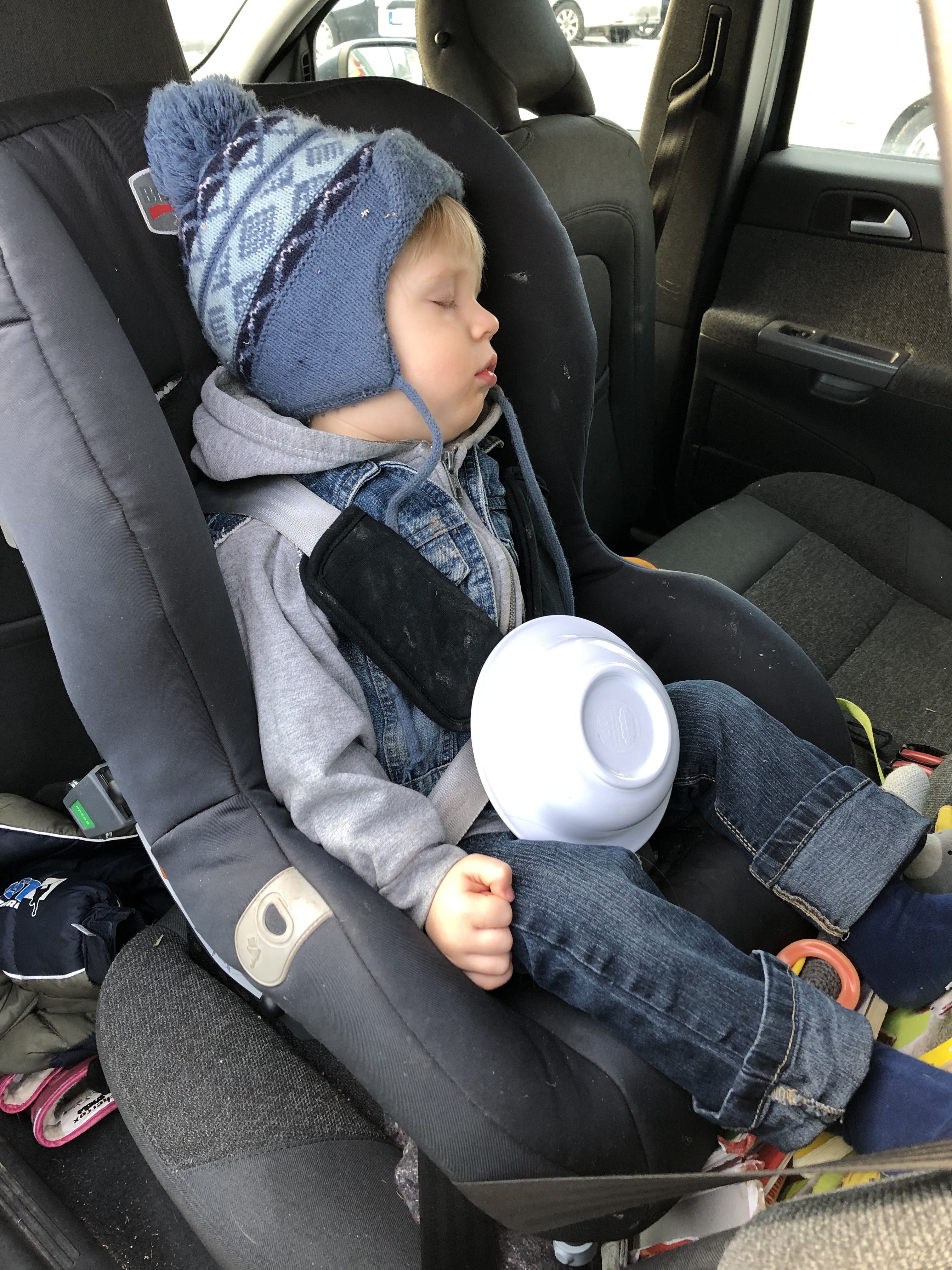 Det kändes nästan som om jag skolkade från jobbet igår, när jag var mammaledig med Loke. Jag fick inte riktigt någon sovmorgon dock, så det blev en produktiv morgon i stället. Tvätt, dammsugning, handling och en tripp till återvinningen med den gamla duschen. Loke insåg väl att det var dumt att hoppa över sovmorgonen och tog igen sig i bilen.