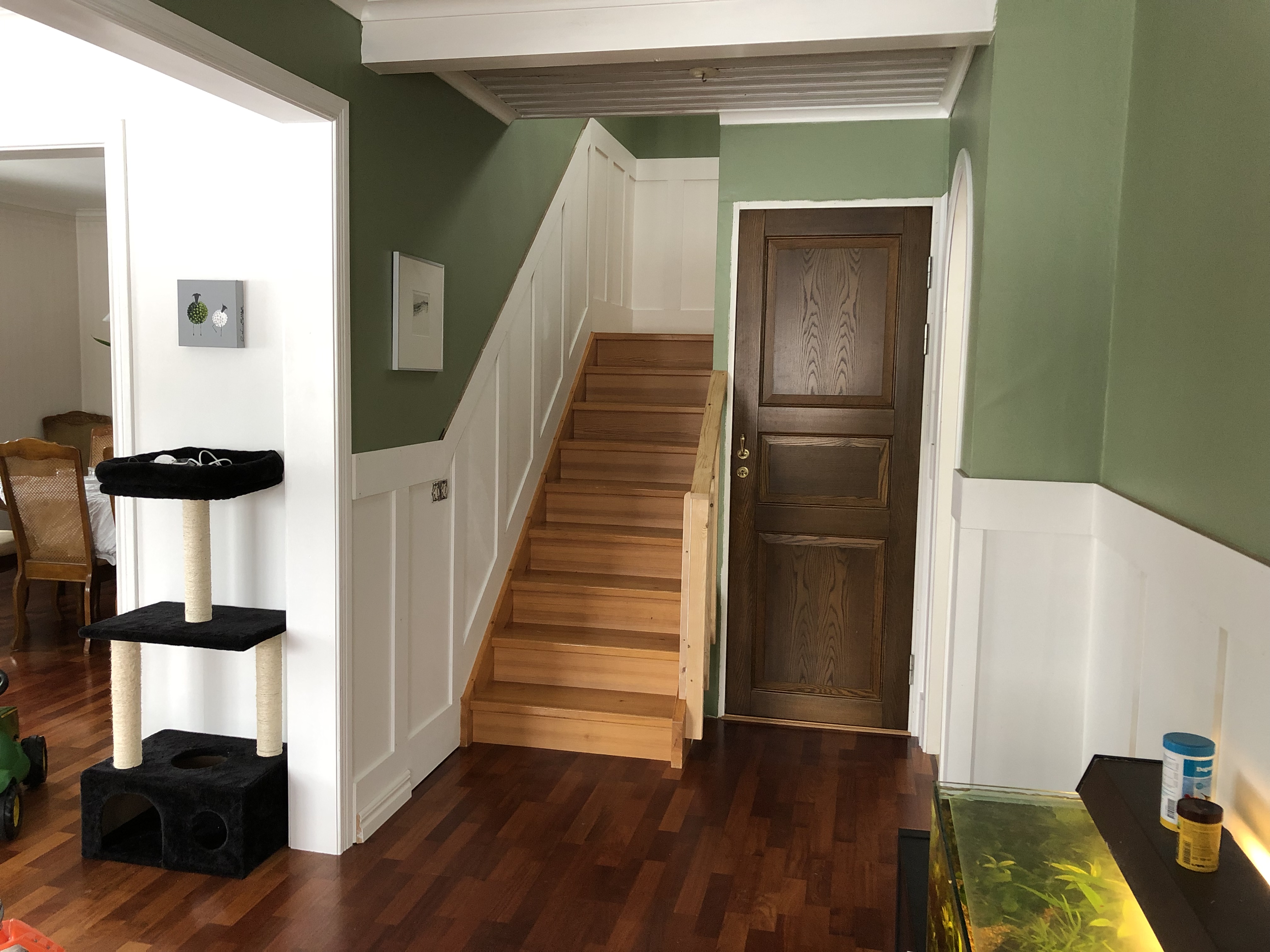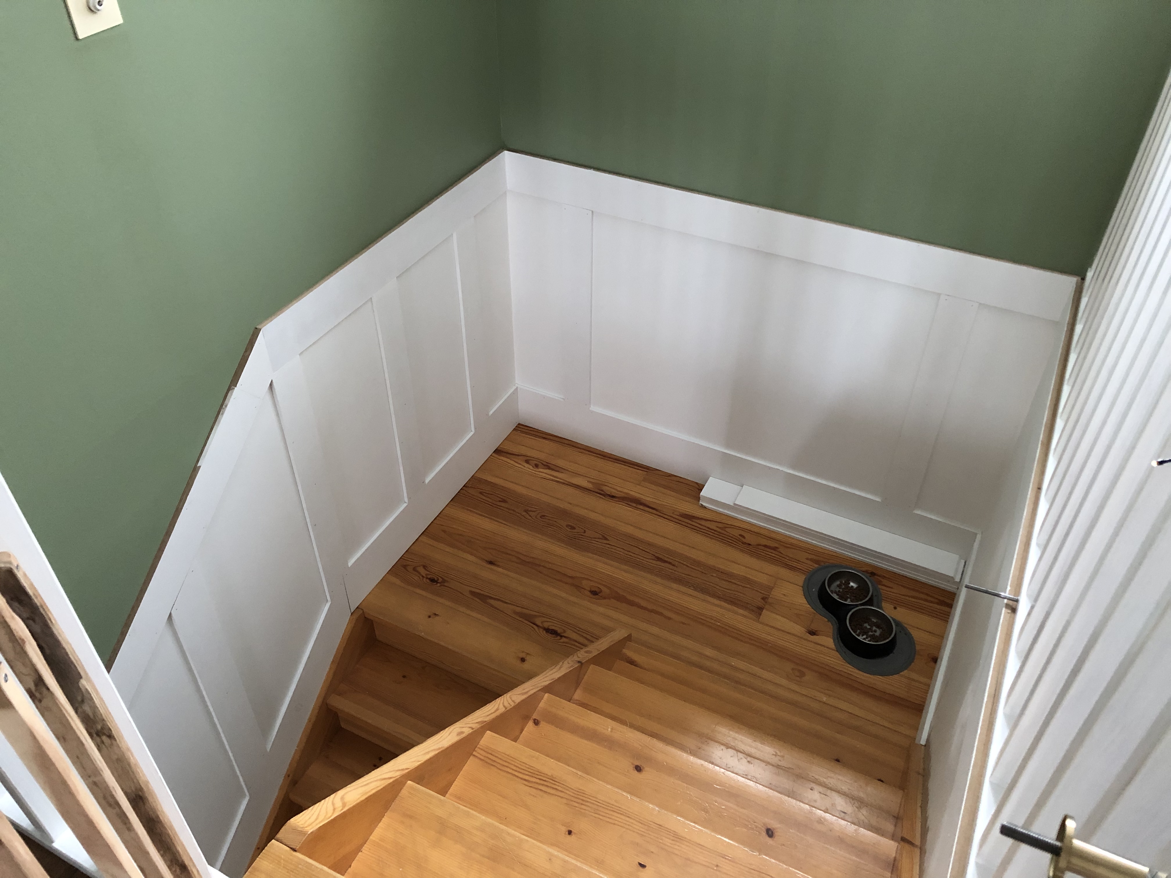 Loke sov även en stund efter promenaden så jag målade lite färg på en panelbit i hallen som vi glömt måla. Så här ser det ut nu! Nästan all panel på plats!