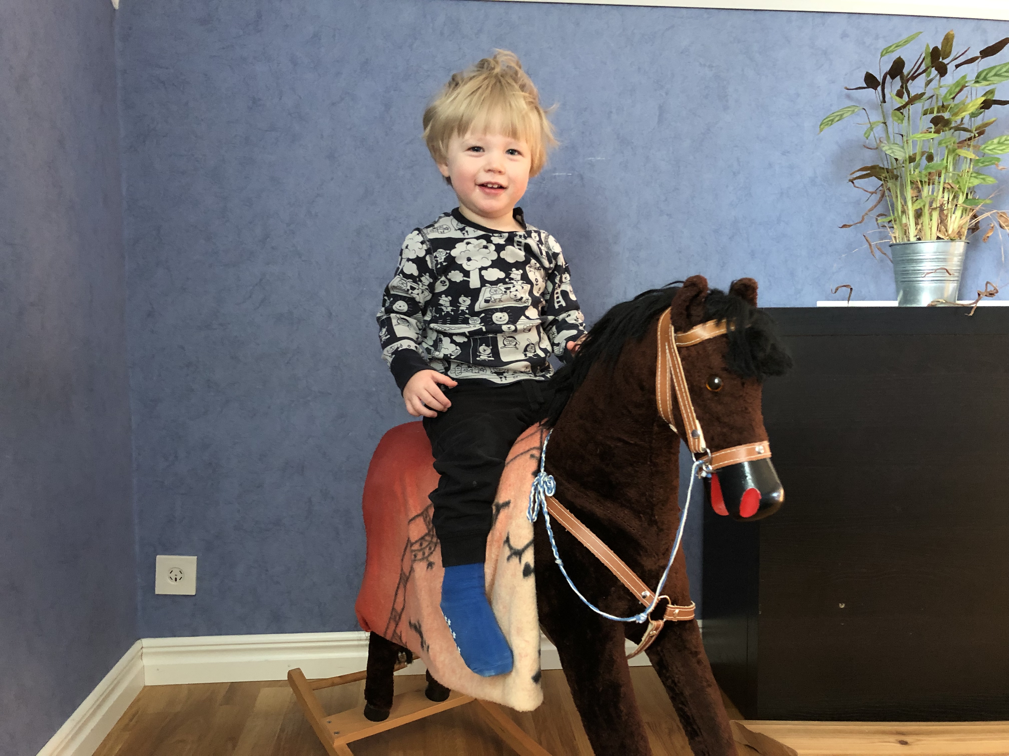 Den första punken kunde han ju redan för ett halvår sen, så det berörde vi aldrig av förståeliga skäl. Loke fick heller inte visa att han kan kladda på ett papper med en penna i handen, men de övriga punkterna checkade vi av. Loke fick hämta och kasta en boll till sköterskan (och visade även att han kan sparka bollen vilket är ”överkurs”). Han passade även på att visa sin hoppteknik och snurrade runt lite allmänt. Sen visade sköterskan hur hon knackade på en liten låda som hon sedan öppnade och visade att det fanns en liten leksak där i och Loke kunde direkt efter detta knacka själv och öppna lådan. Han slog även ut med händerna och visade sin söta låtsas-förvånade ansiktsuttryck när leksaken var borta igen.