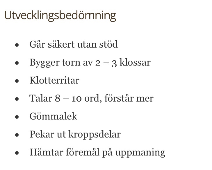 Igår var vi alltså på BVC för kontroll vid arton månaders ålder, inklusive vaccination. Vi vet ju alla redan att Loke är en fantastisk liten pojke, men nu fick vi det bekräftat av BVC också, hehe. Inför skrivandet av detta inlägg googlade jag lite snabbt, och visst finns det ”reglerat” vad som kontrolleras i barnens utveckling vid den här åldern.
