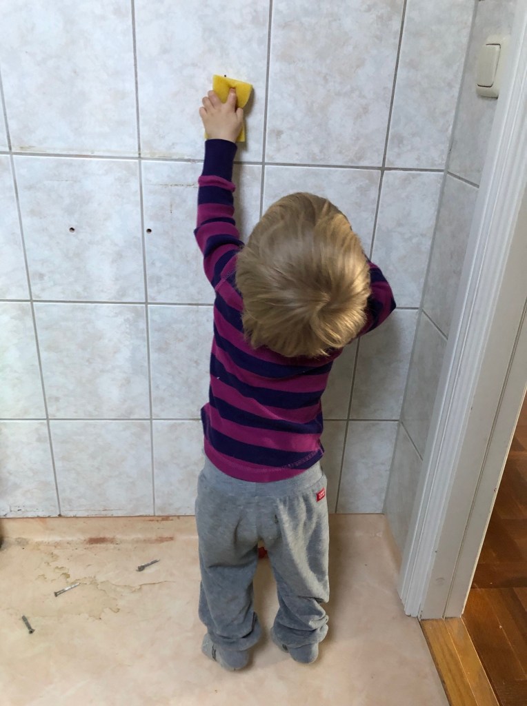 Och för ett par dagar sen började vi riva, efter att ha köpt ny spegel, handfat, möbel och lite krokar! Loke var med och hjälpte till bitvis, såklart.