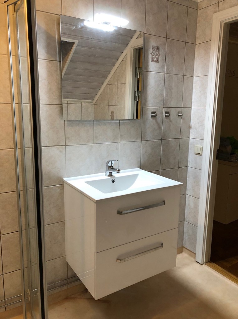 Lite dålig på att ta bilder under tidens gång inser jag, för POFF så var det klart! Det är dock inte städat på bilden så ni får ursäkta golvet och kladdet på spegeln. Det blev himla fräscht och fint!