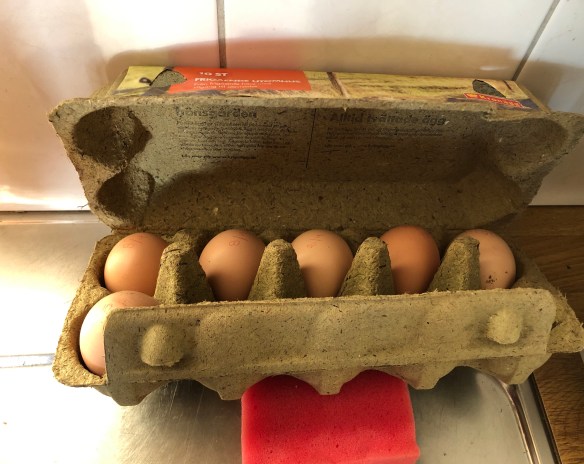 Två ägg låg under henne och vi stoppade dit de ovan så åtta ägg kan potentiellt utveckla sig till kycklingar! Nu tror jag inte vi kan ha sån tur, men jag hoppas att fru Höna orkar ruva hela vägen!