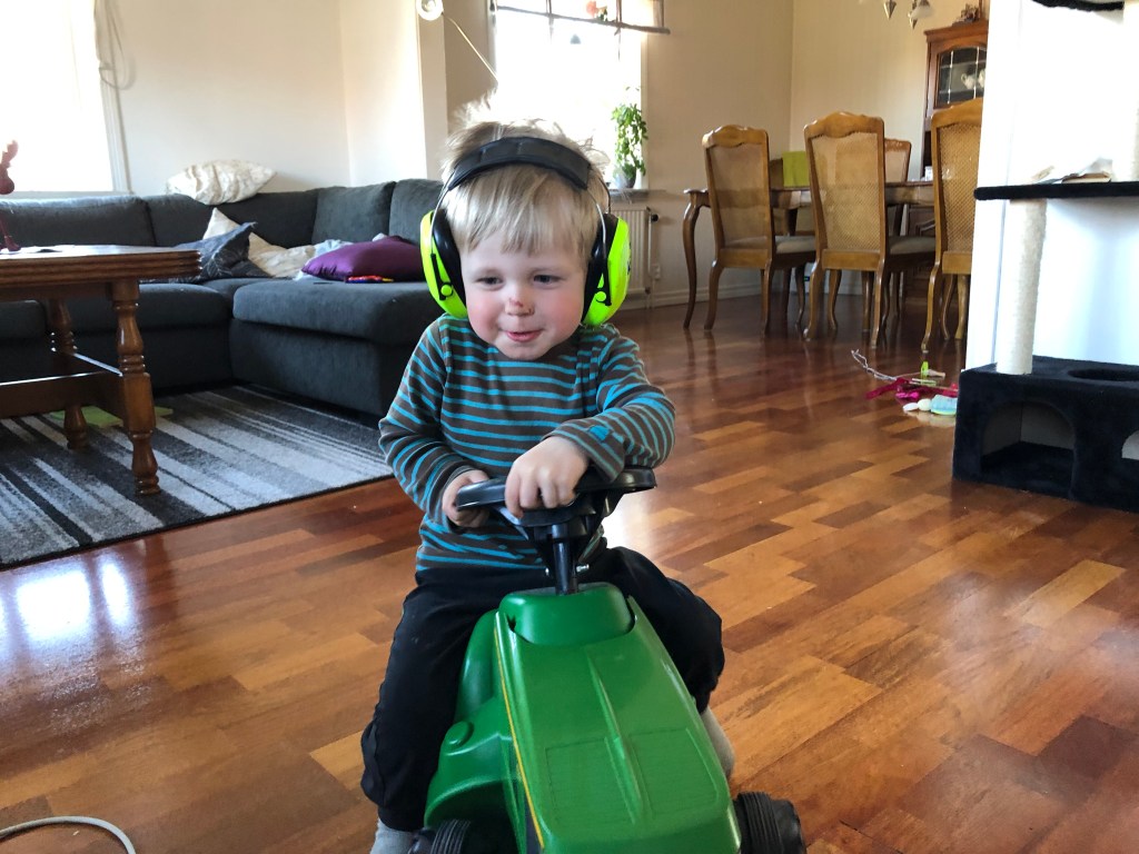 Jag har ingen bild på banbygget heller så avslutar med denna bilden från i förrgår i stället. Det ser ut som att det går fortare än vad det faktiskt gör, han har inte riktigt fått upp farten ännu, hehe. Och ja, pappa har ju hörselskydd när han kör traktor så det är klart Loke ska ha det också…