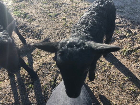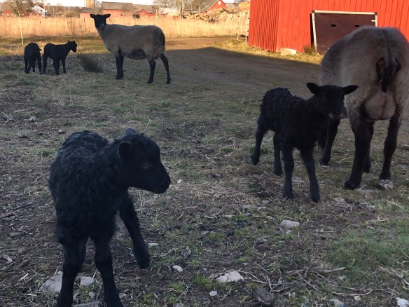 Tackorna och lammen går numera tillsammans och de har möjlighet att gå ut lite på baksidan av ladan och peta i sig lite gräs. Uppskattat av både de vuxna och dr söta små lammen som har mer yta att skutta runt på. På söndag släpper vi ut dem i hagen vid huset, och då får även Baggis hänga på. Då är de minsta lammen nästan en vecka gamla och det ska vara flera plusgrader även på nätterna så det blir nog bra. Skönt för fåren att komma ut på lite mer gräs!