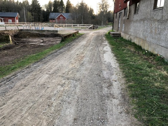 Vi inledde dagen med att ta bort fårnätet runt gårdsplanen där fåren gått och så ville hästarna ha en ny höbal. När traktorn ändå var framme körde Axel ett par vändor på grusvägen och skrapade den med plogen. Den värsta ”bullen” i mitten av vägen försvann och det blev några hålor färre.