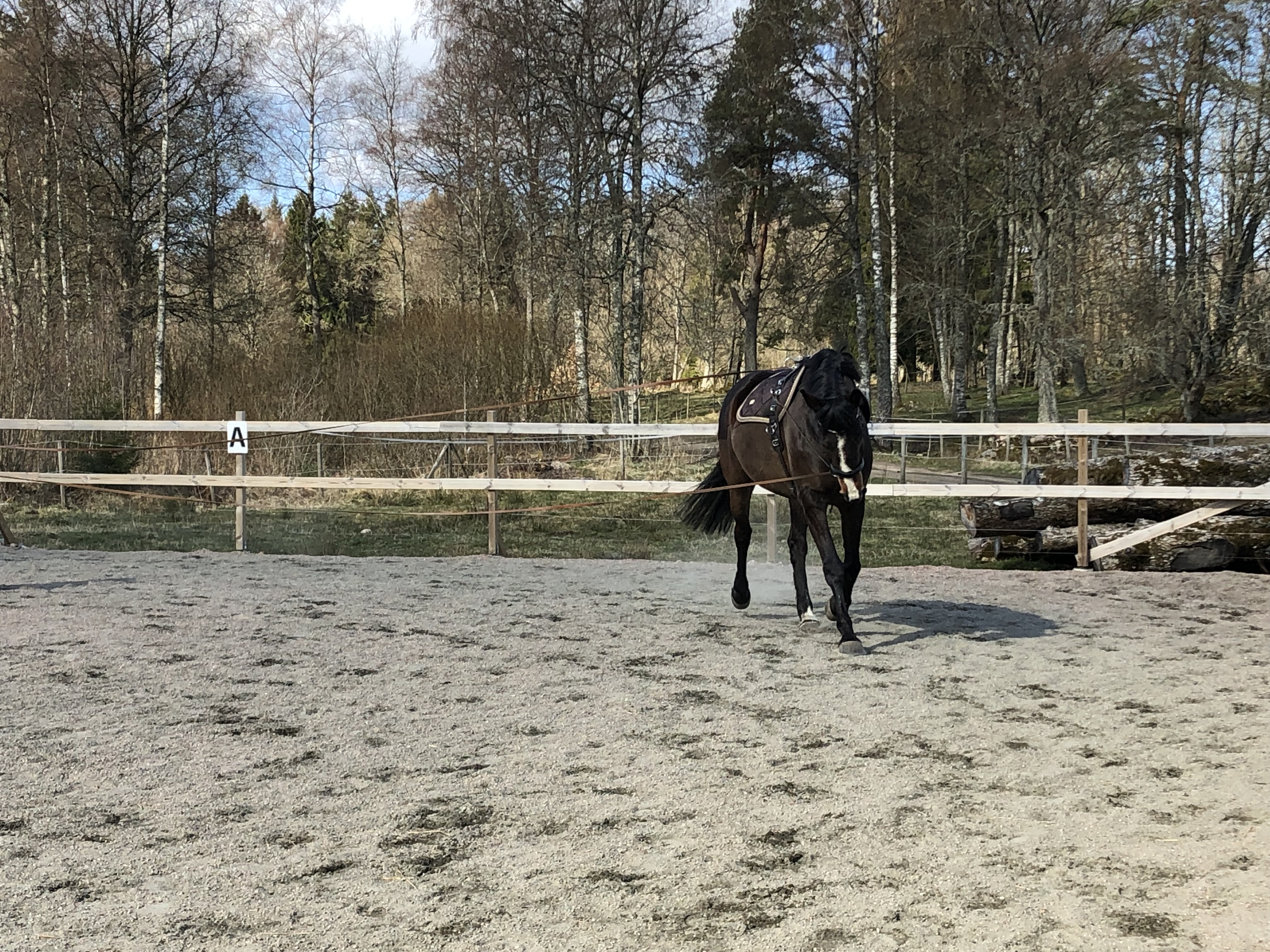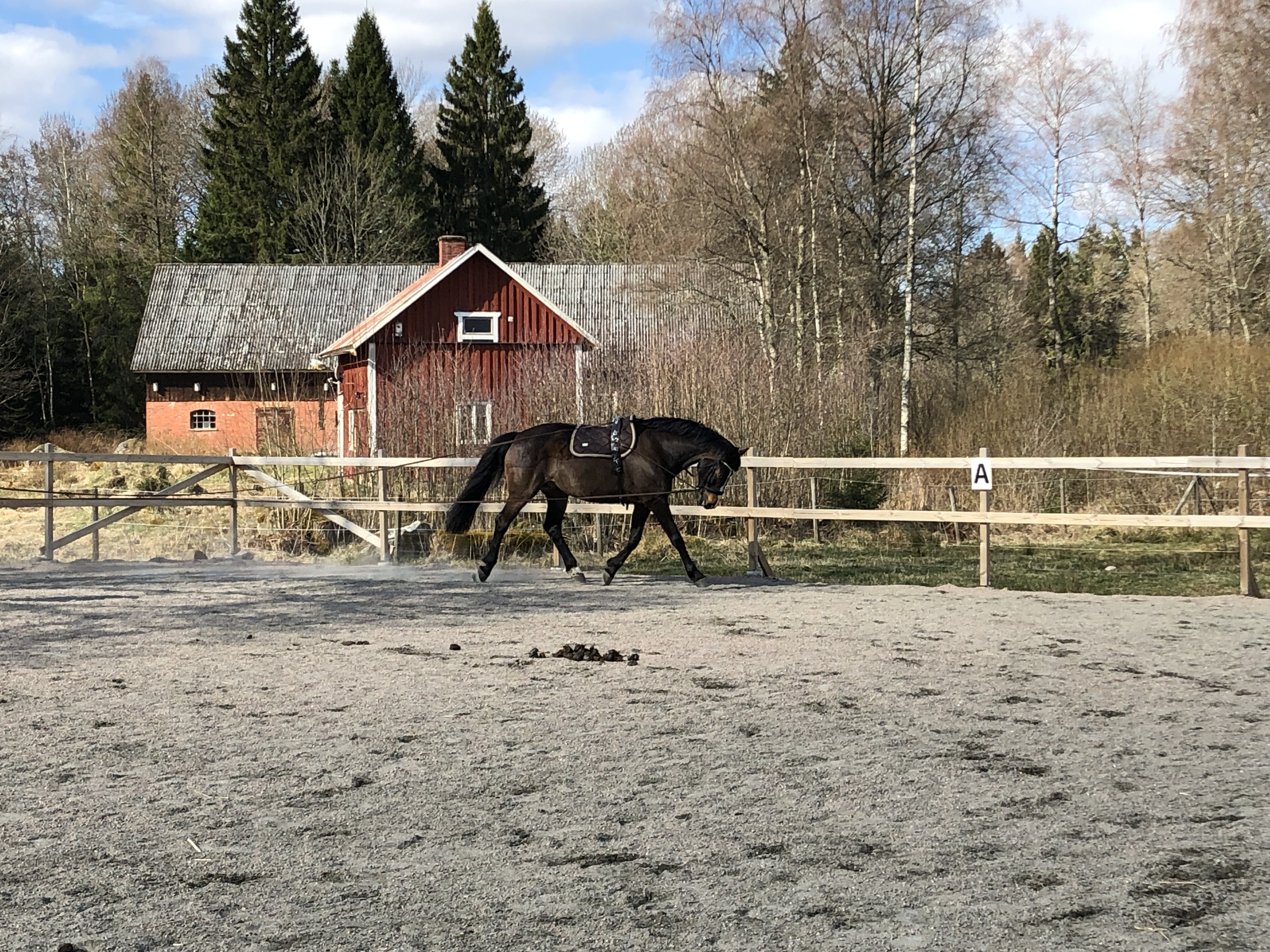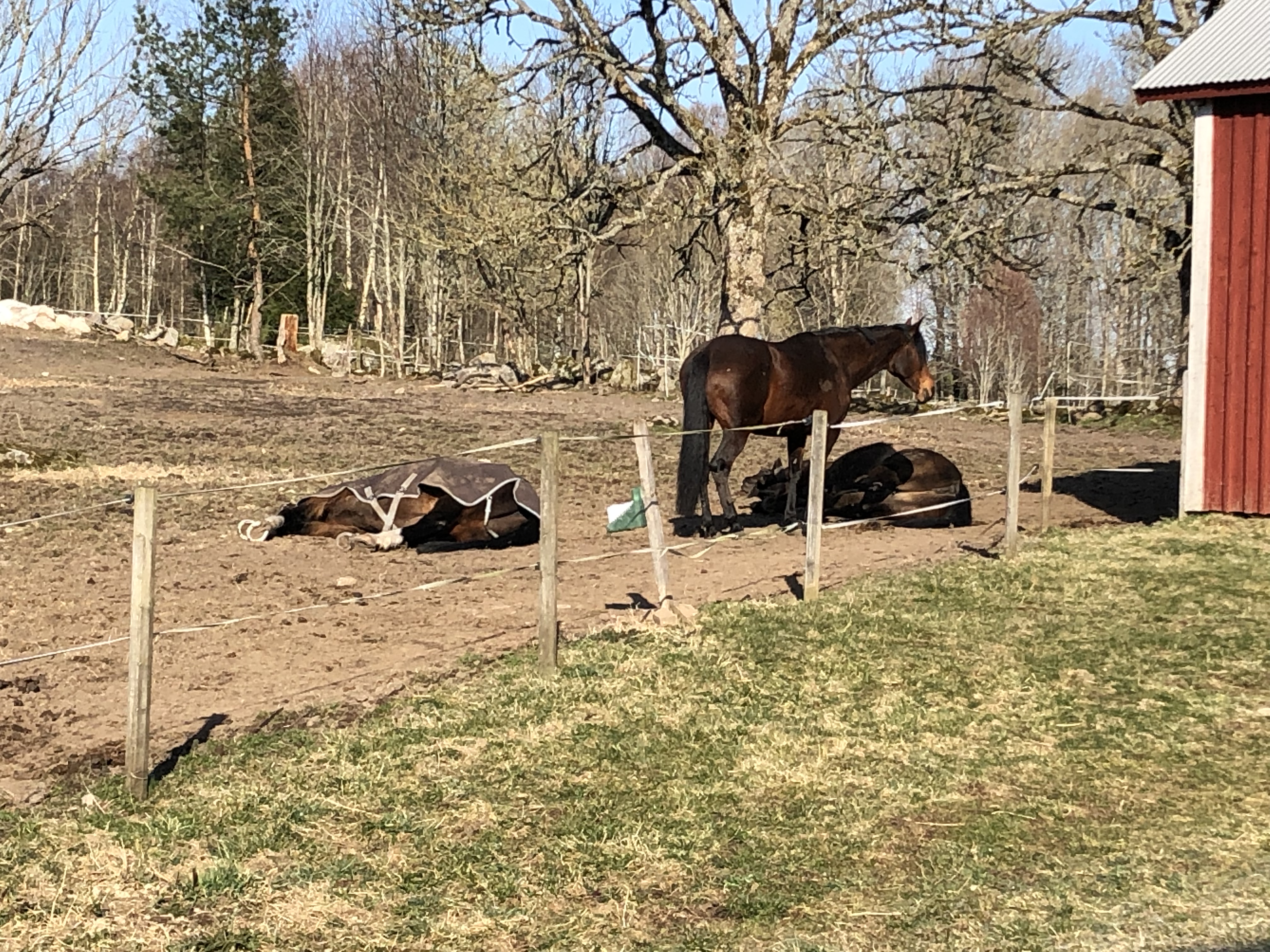 Vi inledde dagen med att ta bort fårnätet runt gårdsplanen där fåren gått och så ville hästarna ha en ny höbal. När traktorn ändå var framme körde Axel ett par vändor på grusvägen och skrapade den med plogen. Den värsta ”bullen” i mitten av vägen försvann och det blev några hålor färre.