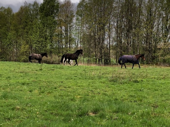 Idag har hästarna fått komma ut på gräs! De blev lyckliga över detta och drog några repor i galopp innan de sänkte ner sina huvuden och började äta. Jag hade inte med mig kameran (vädret var inte så kameravänligt) men mobilen tog några halvkassa bilder.