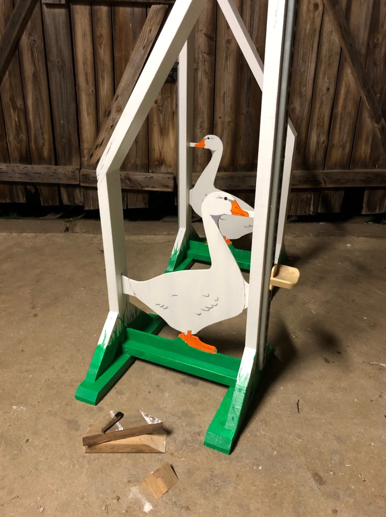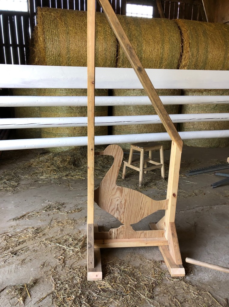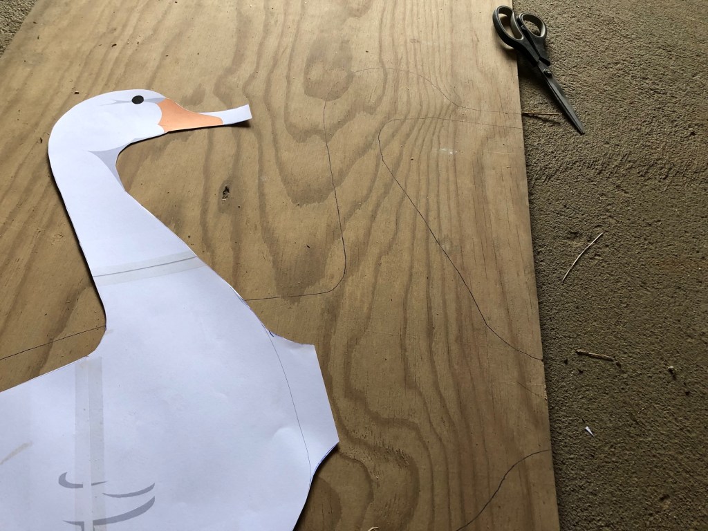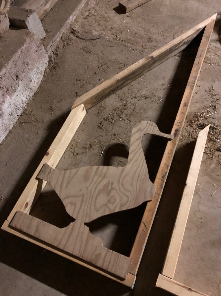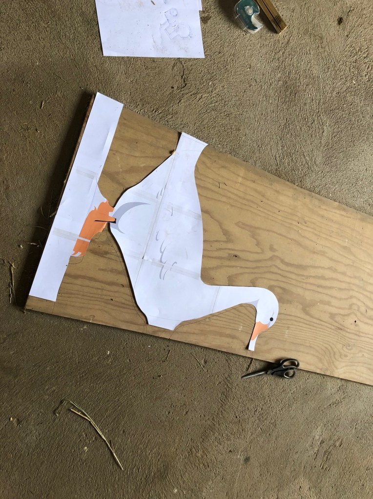 Det är alltså två gäss ”Gäsenegäss” och hindret består av en planka och ett gäng bommar. Jag, Axel och Loke tog hästsläpet till anläggningen och hämtade hem lite bommar och en planka som ändå behövde renoveras, och så fick vi med oss lite virke till byggandet av infångarstöden. Sen var det bara att sätta igång! Vi började att rita upp och såga ut gässen ur en skiva: