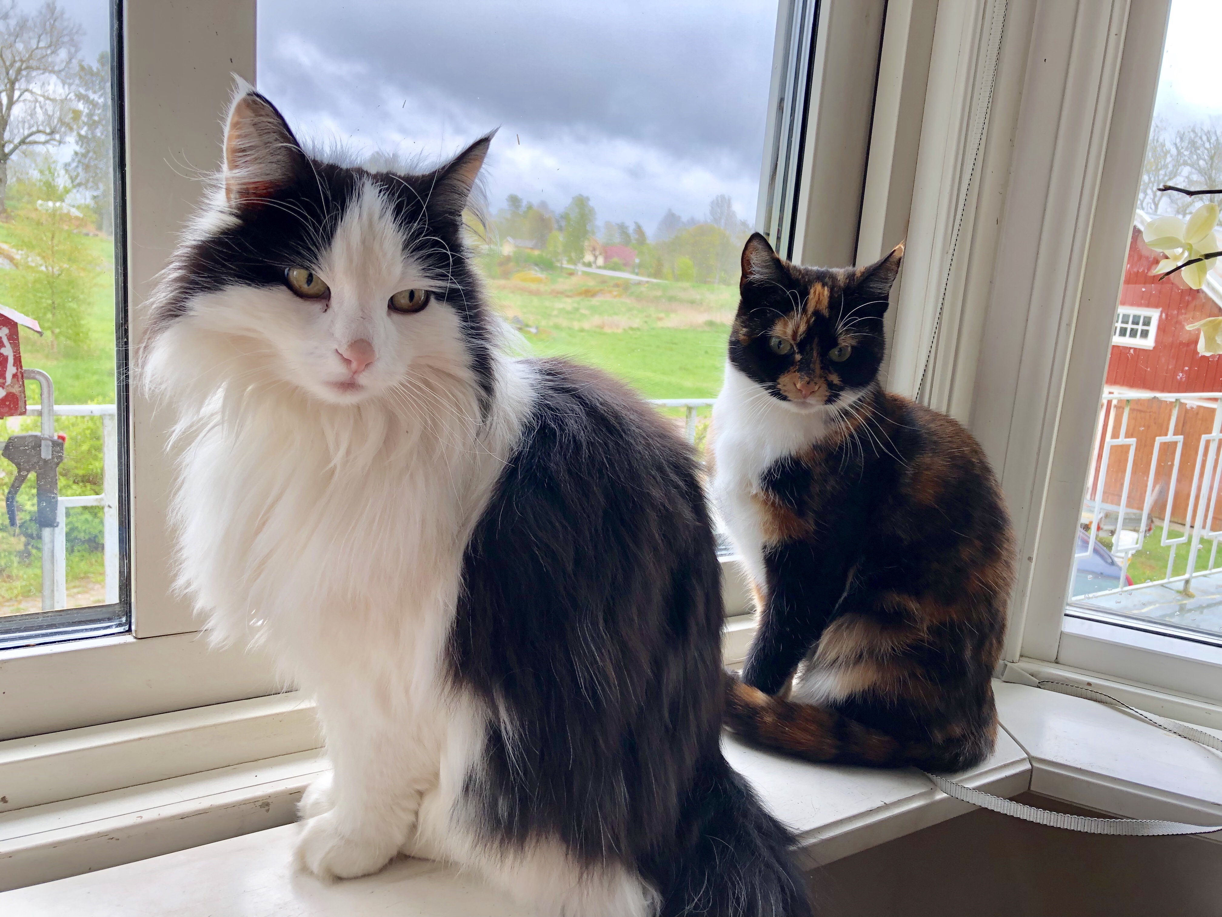 Två av våra fina katter ovan. Som inte verkar bry sig så mycket om kycklingarna av det jag har sett. Tror hönsen satt sig i bra respekt där sen tidigare. Femlingarna hos Brons käkar och växer och rör sig på allt större ytor och Koppar hade fortfarande två kycklingar hos sig i går kväll. De ligger nästan bara under henne ännu, tillsammans med det tredje ägget. Vet inte hur stor chans det är att det blir en tredje kyckling där men hon vet väl bäst själv när det är dags att ”ge upp”.